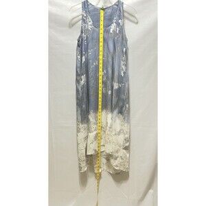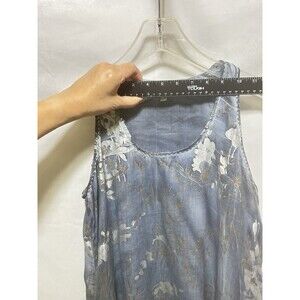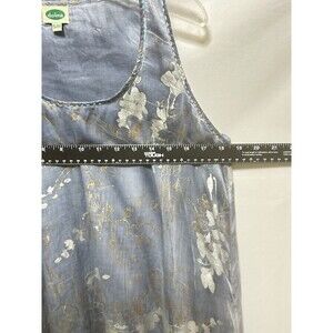 The Dolma Women's S/M Blue Sleeveless Cotton Dress with Gold Outlined Floral Pattern is a stylish and lightweight midi dress perfect for any occasion. Made from comfortable cotton material, this hi-low dress features a round neckline, pullover closure, and lined interior for added comfort. The gold outlined accents add a touch of sophistication, while the pockets add a practical element to the design. Ideal for women looking for a versatile and trendy dress option.