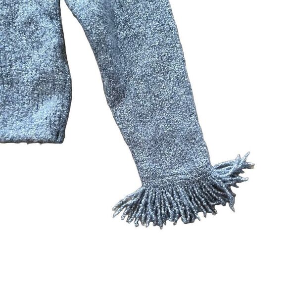 This is in good condition. Long sleeve with fringe on the ends. Mock turtleneck. 100% cashmere