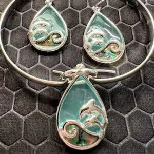 A beautiful dolphin-themed bracelet and earrings set. The Bracelet is 7.5 inches in length. The earrings are 1.0 inches all around and has a drop-down length of 1.5 inches.