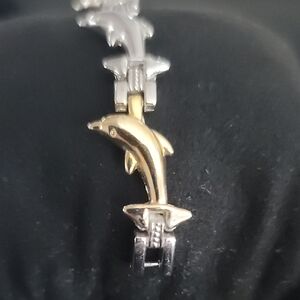 This bracelet features alternating silver and gold dolphins with a fold-over clasp. used.