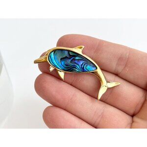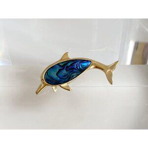 Gorgeous gold toned vintage dolphin brooch. The brooch has faux abalone at the center and is bezel set. Textured posterior. The brooch is large and gorgeous. This piece is from the 90's.