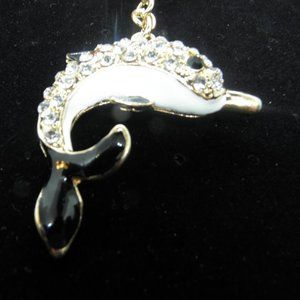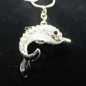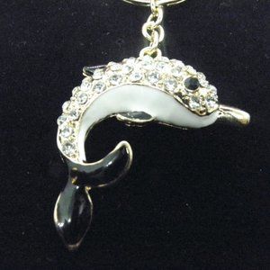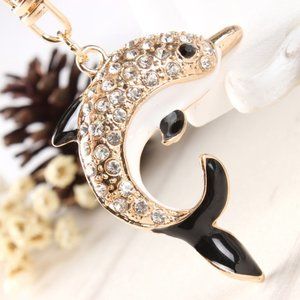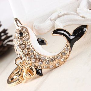 A beautiful Rhinestones and Enamel Dolphin Charm Keyring, The Dolphin is decorated with clear shining Crystals and black & white Enamel and the back has a Heart-shaped hollow-out Design.