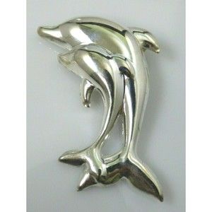 This lovely vintage pendant brooch combo and earring set was found at an estate sale. It includes a shiny silver tone pendant/brooch with a pair of dolphins. It comes with a matching pair of earrings. The back of the pendant/brooch has a hook fastener to wear as a brooch and a loop at the top for wearing it as a pendant. The earrings are pierced hooks that open up. The pendant brooch measures approximately 2.38" high x 1.63" wide x .49" deep. Each earring measures approximately 1.54" high including the hook x .62" wide. There are no markings on the pendant/brooch or earrings to indicate a brand. Please note that there is a little vintage wear on the set with some light surface scratches, but the set is still in good vintage condition and very pretty and unique.