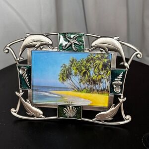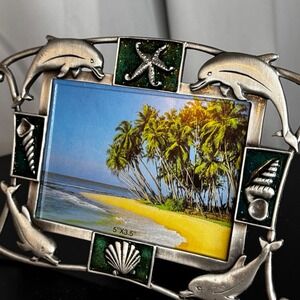 Keywords: dolphin picture frame, nautical picture frame, coastal decor, beach themed frame, seashell frame, starfish frame, 5x3.5 picture frame, silver picture frame, coastal home decor, beach house decor, nautical gift, ocean themed frame