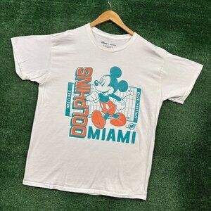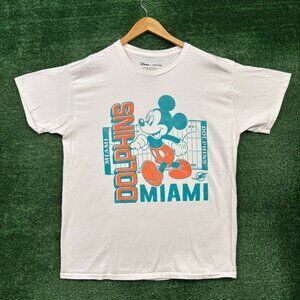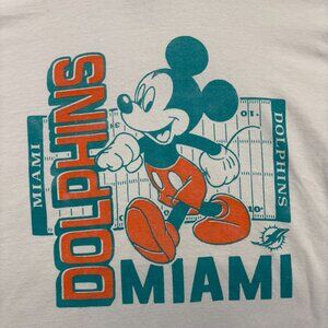 Dolphins x Disney white T-Shirt Size Medium. Fun crossover design featuring playful graphics and team spirit. Measures 22” pit to pit and 27” long for a comfy fit.