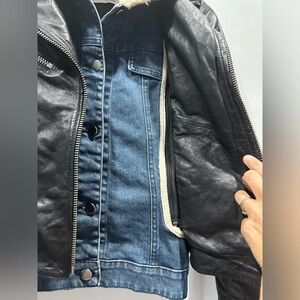 Full zip with silver accents with removable denim jacket underneath and removable fur around collar