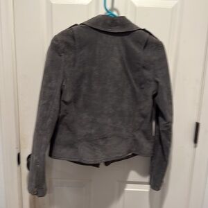 Excellent condition only worn one time. Beautiful suede jacket in gray color. The interior has a beautiful pink lining adding to the beauty of the jacket. Feature two front zipper pockets. Gorgeous jacket perfect for year round.