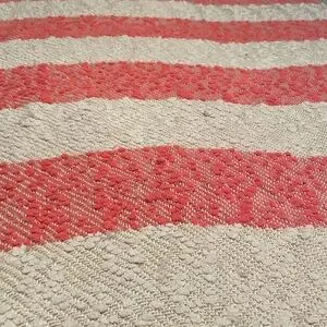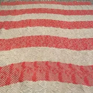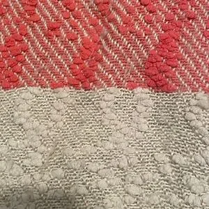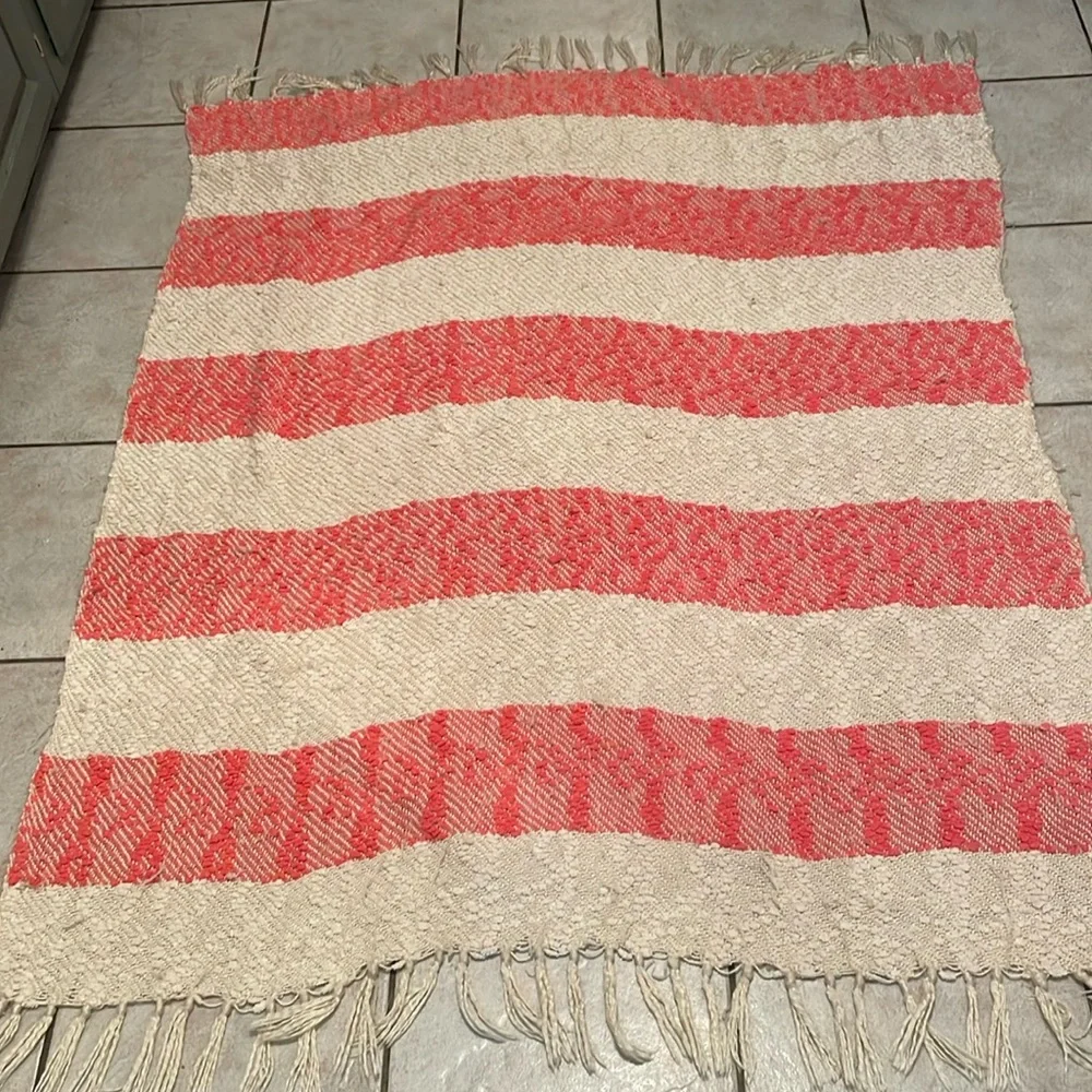Domain coral/off white throw with fringes. Beautiful and so soft that measures 64” (including fringes) x 47”. Material is really nice but gets “fuzzy” easy.