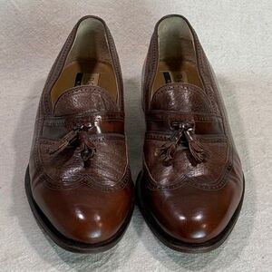 Previously worn; made in Italy; leather uppers with tassels; foot is made of contrasting pieces of leather- smooth and pebble-textured; cushioned leather insoles; leather lined; leather outsoles; stacked leather heels with rubber wear guards. Shoes are in excellent condition; there are a few small light scuffs on toe of right shoe; soles are in great shape; light wear at the heels. #johnstonandmurphy #bootandshoetraders