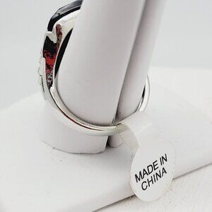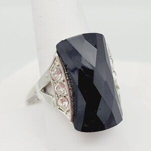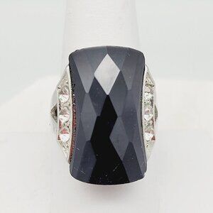 Domed Black Faceted Glass & Rhinestone Statement Ring Sz 9 Silver Tone Rectangle