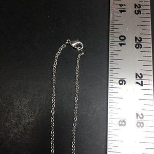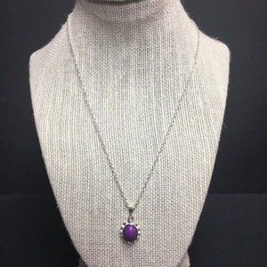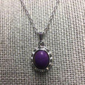 Delicate silvertone chain with purple domed oval shaped pendant and ruffled edge!