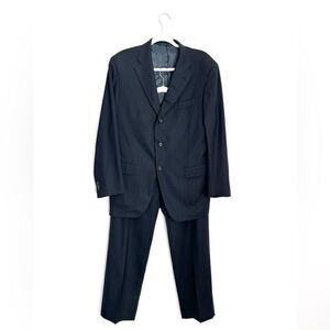 Excellent condition, no flaws. Very dark navy, looks black unless in direct sunlight. Subtle brown pinstripes.