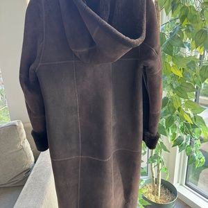This is a beautifully designed, brown shearling coat that comes with a hood. Have worn a few times, but still in great condition!