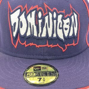 Dominican hat with Graffiti style script from New Era. 59fifty model, made of 100% Wool. Fitted size 7 1/2- 59.6 cm. Front of hat is spell out graphic. Back of hat is embroidered with Dominican Republic Flag and initials "DR" over it.