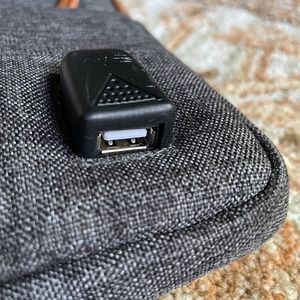 Comes with attached hidden USB battery with charge cord and removable clip shoulder straps.