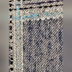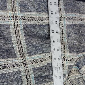 New With Tags Don Caster Collection Denim Color Jacket Women's Size 10. 33% silk 25% cotton 21% nylon 21% polyester, trim polyester wool and spandex. Front zipper closure, plaid Tweed design with silver metallic threads, cuffs can be turned up.