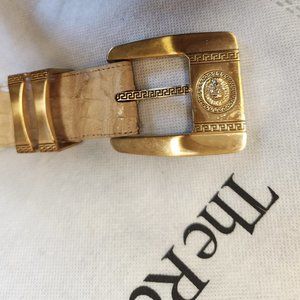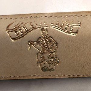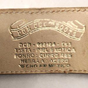 From Mexican leather artist Don Cuco, this stylish ivory crocodile leather belt. Size 34, it measures 42 inches from buckle to tip; the shortest-hole measurement is 32 inches. The buckle and plaques are stamped "trademark," and stamped in gold into the leather is the Don Cuco emblem and specifics about the style number, and the "exotic" crocodile skin guarantee. From a smoke-free, dog-loving home. Your questions welcomed.