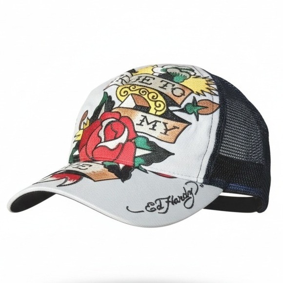 Don Ed Hardy Mesh Trucker Hat Cap True to My Love Two Tone Denim/Gray.