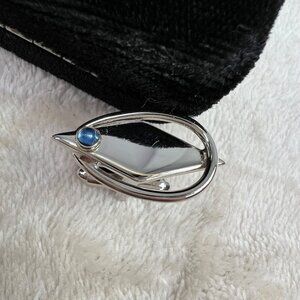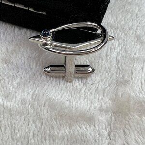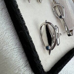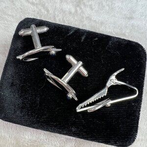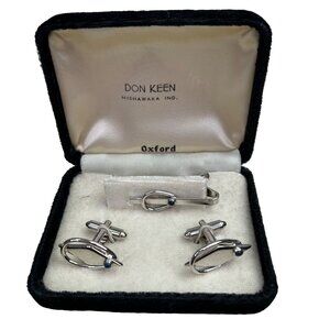 Don Keen Oxford cufflinks and tie clip set in original box. Silver tone with blue stone. Good condition. Clip measures approx 1-1/2" long, cufflinks are approx 1" long.