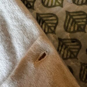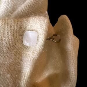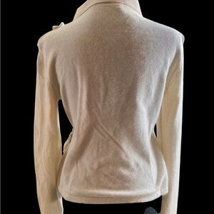 Soft and cozy, this 100% cashmere cardigan has unique details. Beautiful cream color. Vertical ruffles and square buttons. As you can see, tag is semi-detached. The only other callout is the missing button cufflink on the left sleeve. Measures unstretched approximately 18.5” PTP, 18.5” shoulder width, 22” sleeve length, and 22” shoulder to hem.