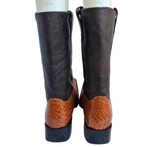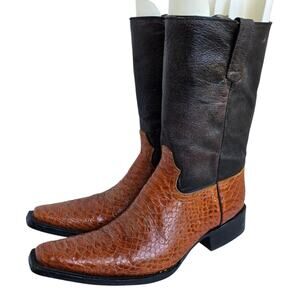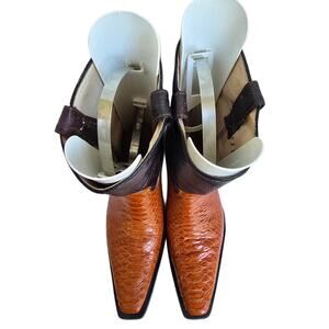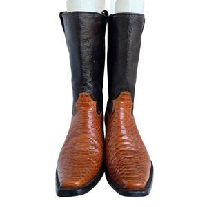 2 tone mixed leather upper: Dark brown leather shaft, vamp is an orange/tan/brown reptile snake scale look textured leather. Pull on style, chunky heel, pointed snipped snub toe w/ square edge, classic western seam details. Issues noted in photos. Good preowned condition, overall. Marked Mexico size 27.5. No US Size marked, but should roughly be a men's 8.5/9 women's 10.