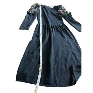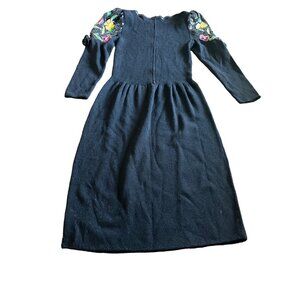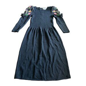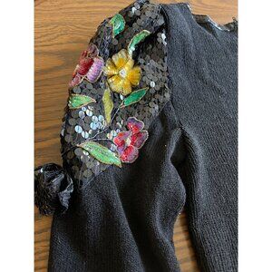 Vintage ‘80’s Don Sayres for Wellmore Neiman Marcus black sequined sweater evening dress size 14. Zips in back. Rack upper sleeve has sequined flowers with pearls. Dies have shoulder pads. Black sequins around scoop neck. Keep in mind vintage sizes typically run smaller than today’s sizing. Good pre-owned condition.