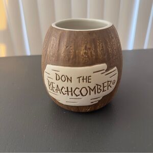 Unique tiki mug with a wood-like texture. Features 'Don the Beachcomber' logo. Perfect for tropical drinks.