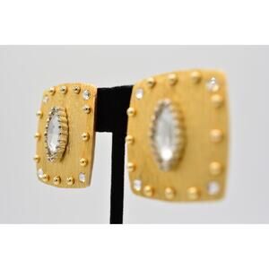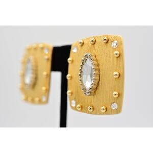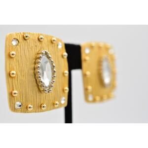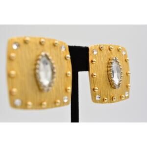 Don-Lin Vintage Clip On Earrings Brushed Gold Crystal Chunky Signed 1980s BinAI