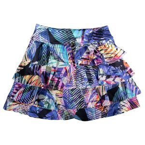 The Dona Jo Skort S in Women's multicolor short polyamide is a stylish and versatile piece perfect for all seasons. This pull-on skort features a unique abstract pattern, ruffle accents, and a comfortable elastic waist. Made with a blend of spandex and polyamide, this lightweight and stretchy garment is machine washable and easy to care for. With its casual style and practical features like pockets, this skort from Brazil is ideal for the summer and spring seasons. Waist: 23", Length: 13.5"