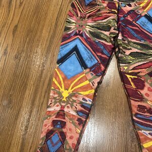 Dona Jo Leggings Womens 2 Medium Large Abstract Black Blue Pink Yellow Stretch Approximately 13 across waist, 9 rise and 26 inseam Good condition