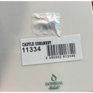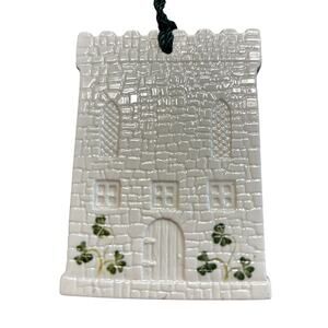 Donagal Belleek creamy white porcelain castle ornament with tiny green shamrock details on the embossed surface. Green silk tassel at the top to hang this beauty with ease. Clearly hallmarked and in excellent condition - add this to your collection today!