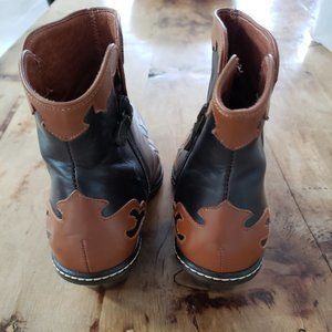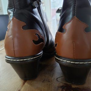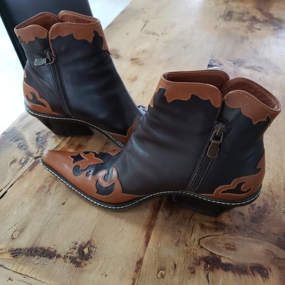 Great pair of ankle boots from Donald J Pliner Western Couture collection. Made in Italy, beautifully crafted wonderful to wear, in great condition. Only worn a few times and always noticed. Somehow the heel caps got a sticky residue. I had the heels replaced. Shown in last photo.
