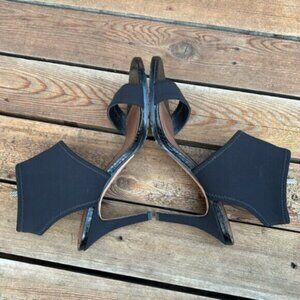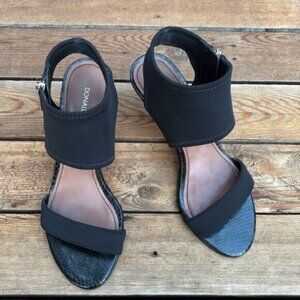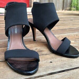 Sexy and elegant black stiletto Tilda sandal by Donald J. Pliner. Size 38 = 8M. Snake skin look & woven poly slightly-stretchy fabric ankle wrap with silver metallic zipper, the 3-3/4" tapered heel is of the same fabric. Leather insole/leather sole with lug overlay for walking comfort and safety. Very good to excellent condition. Clean and clean smelling.