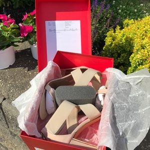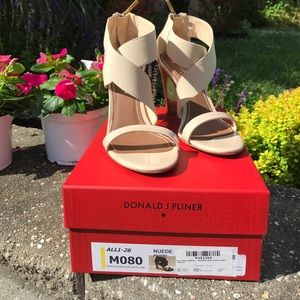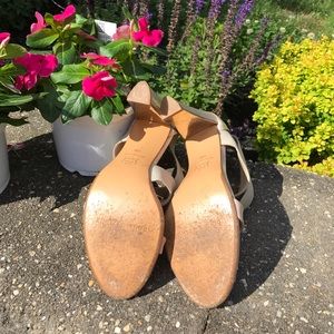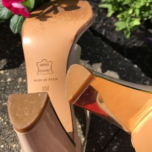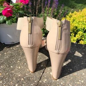 Nude, patent toe strap with nude elastic criss cross strap. Back zipper. Gold mirror on inside of heel. 3.5" heel. Worn three times and in perfect condition. Only ware on bottom of shoe.