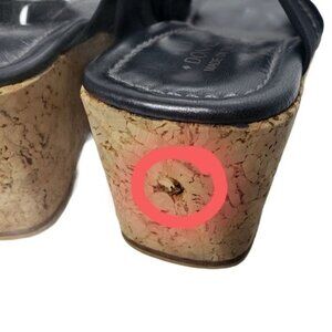 Scuffed soles with visible dirt; cork wedge has a small chip on one heel.