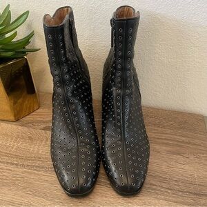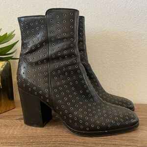 These heeled booties from Donald J. Pliner are so much fun. Black leather with silver grommets throughout. Size 7.