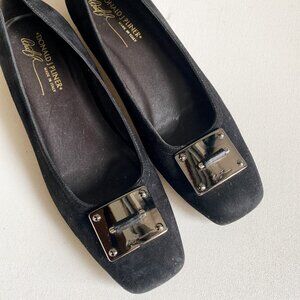 Donald J Pliner Black Suede Metal Monogram Detail Square Toe Flats 8M.