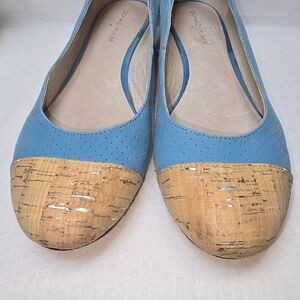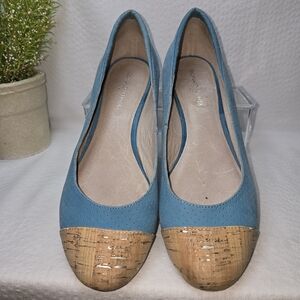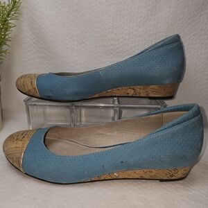 Stylish blue wedges with tan cork accents. Perfect for casual elegance.