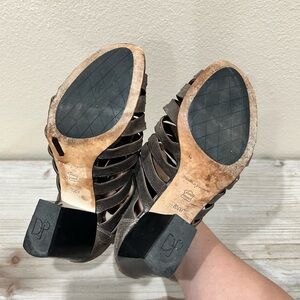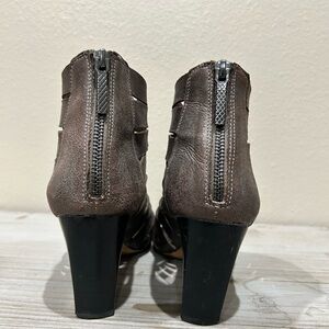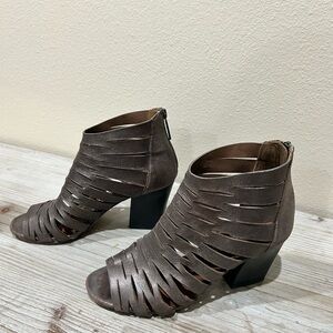 Stylish brown heeled boots with strappy design. Perfect for adding flair to any outfit.