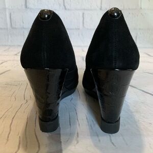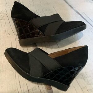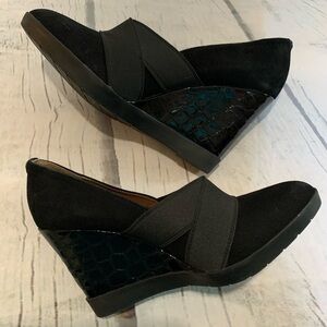 Suede and elastic upper, manmade sole. Slip-on styling with almond toe. Crisscross elasticized strap at vamp. Embossed wedge heel. Measures approximately: 3 1/2” wedge, 1/2” platform. Very good used condition, only signs of wear are a few scratches and scuffs in the suede as shown in pics. Collage consists of stock photos all other pics are actual shoes.