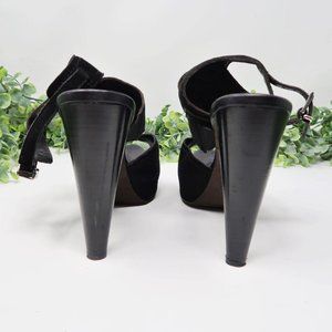 * Features: Black fabric suede with silver ankle buckle strap on this heel / platform / sandal. Platform toe bed, cutout, rounded block heel. Made in Italy. Peep round toe.