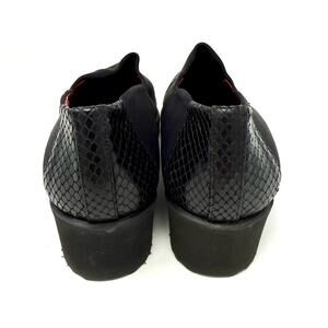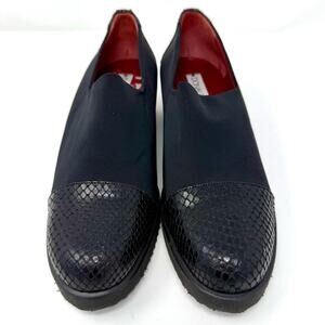 Classic Donald J. Pliner style. Slip on shoe with black elastic upper and snake print embossed leather toe and heel. Chunky platform sole. Sleek and sophisticated.