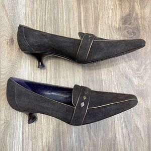 Introducing the stunning Donald J Pliner Couture Mena 7M brown leather loafers, perfect for adding a touch of sophistication to any outfit! These like-new shoes feature a stylish low heel measuring 1.75 inches, providing both comfort and elegance. The eye-catching gold diamond accent adds a unique and luxurious touch to these already chic shoes. Ideal for both casual and formal occasions, these loafers are a versatile addition to any wardrobe.