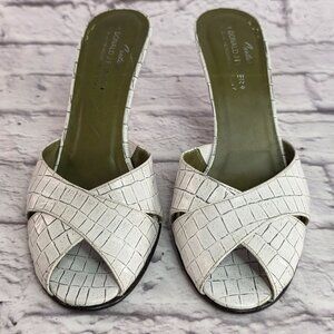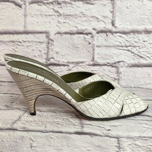 These elegant Donald J Pliner Couture heels sandals feature a chic croc-embossed white design and open toe for a sophisticated look. Perfect for a refined ensemble, these Italian-made heels ensure comfort with a stylish 3-inch heel that adds a subtle lift. Effortlessly elevate your wardrobe with these timeless pieces.