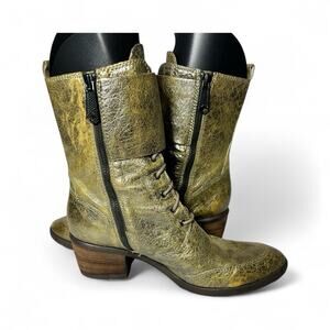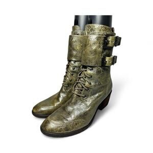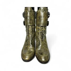 Donald J. Pliner Danti Antique Gold Leather Lace Up Buckled Combat Boots 9.5M