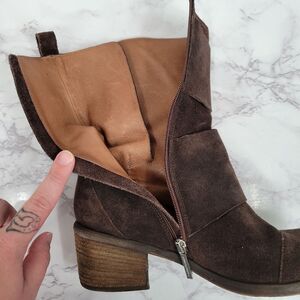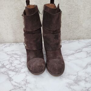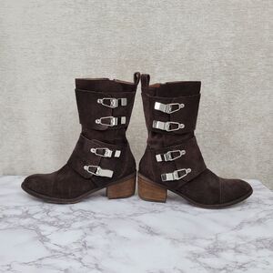 Donald J Pliner Dorria Brown Suede Silver Buckles Mid Calf Block Heel Boots