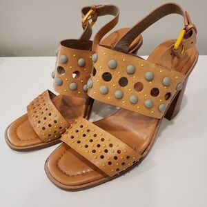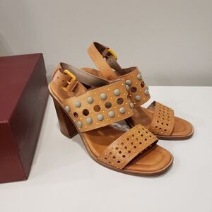Donald J. Pliner Estee leather ankle strap sandals in excellent condition. Block heel. Studded. Approximately 4" heel. Adjustable slingback. Size - 9M.