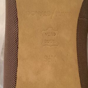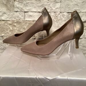 These are the Donald J Pliner Flory kitten heel pumps. They are designed with a stretch metallic mesh fabric upper and feature a complementary metallic heel cap. The shoes feature a covered kitten heel, typically around 2.4 inches high. They have a classic pointed-toe silhouette.The upper part is made from a stretch metallic mesh fabric, with a reconstructed leather sole.