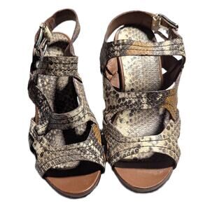 Beige and brown snakeskin textured leather strappy sandals with a buckling slingback strap and a 3.5" wedge heel, from Donald J. Pliner.