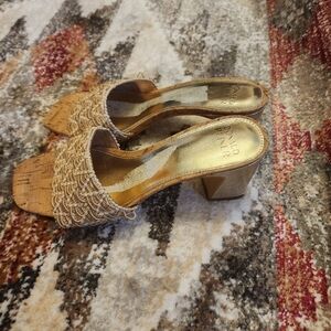 Chic heeled sandals with gold accents. Tan cork base adds a natural touch. Perfect for stylish outings. sold as shown in photos